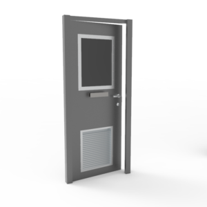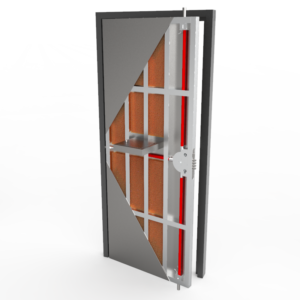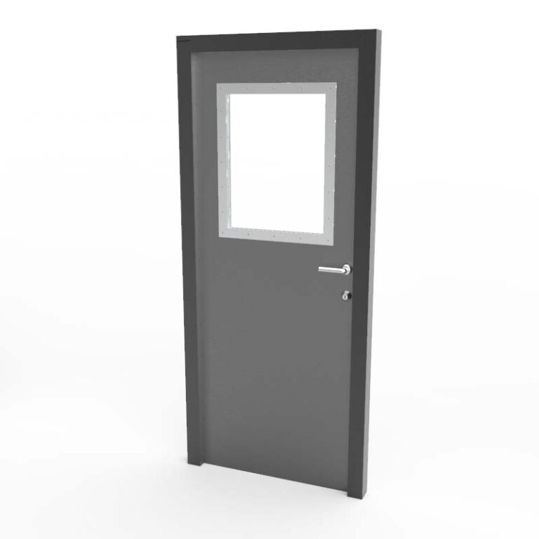 Puertas fabricada en acero con reja interior y planchas de acero por ambos lados, montadas en marco de acero con pomeles.