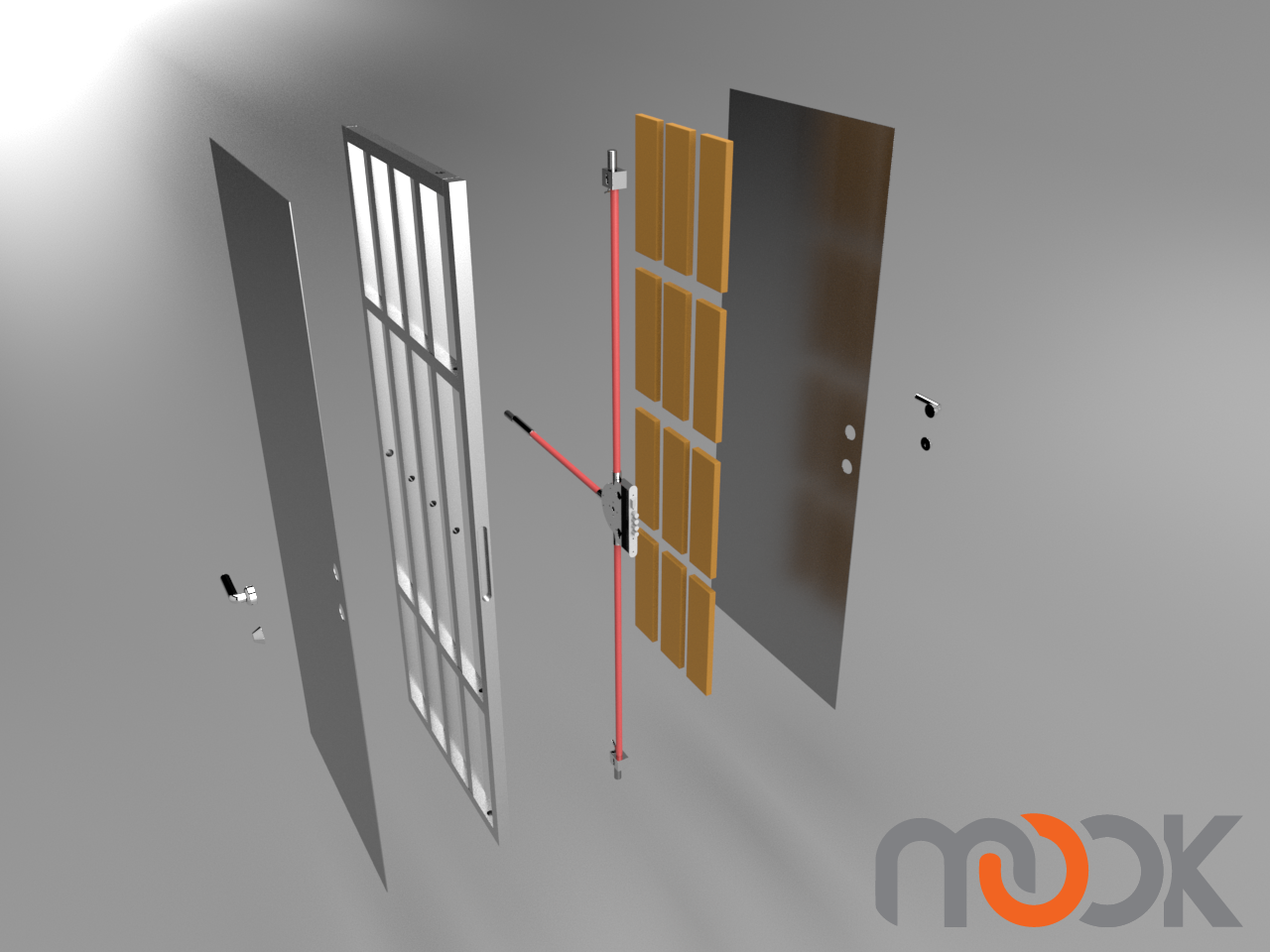 Todos los sistemas de seguridad que refuerzan la puerta van por su interior atravesando las rejas metálicas interiores y llegando a los extremos conectando con pestillos retráctiles, estos aseguran un buen cierre y fácil accionamiento de cierre y apertura de la puerta.